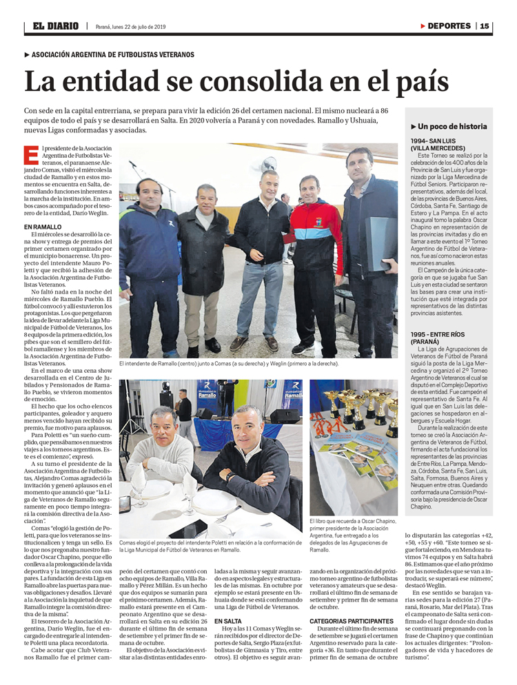 Por otro lado se analizaron dos sedes que recibirían con beneplácito el torneo argentino de veteranos. Se trata de Mar del Plata y Mendoza. Con la primera ya se trabaja con Deportes de la provincia de Buenos Aires y la segunda sede postulada ya acercó propuestas de dos predios.