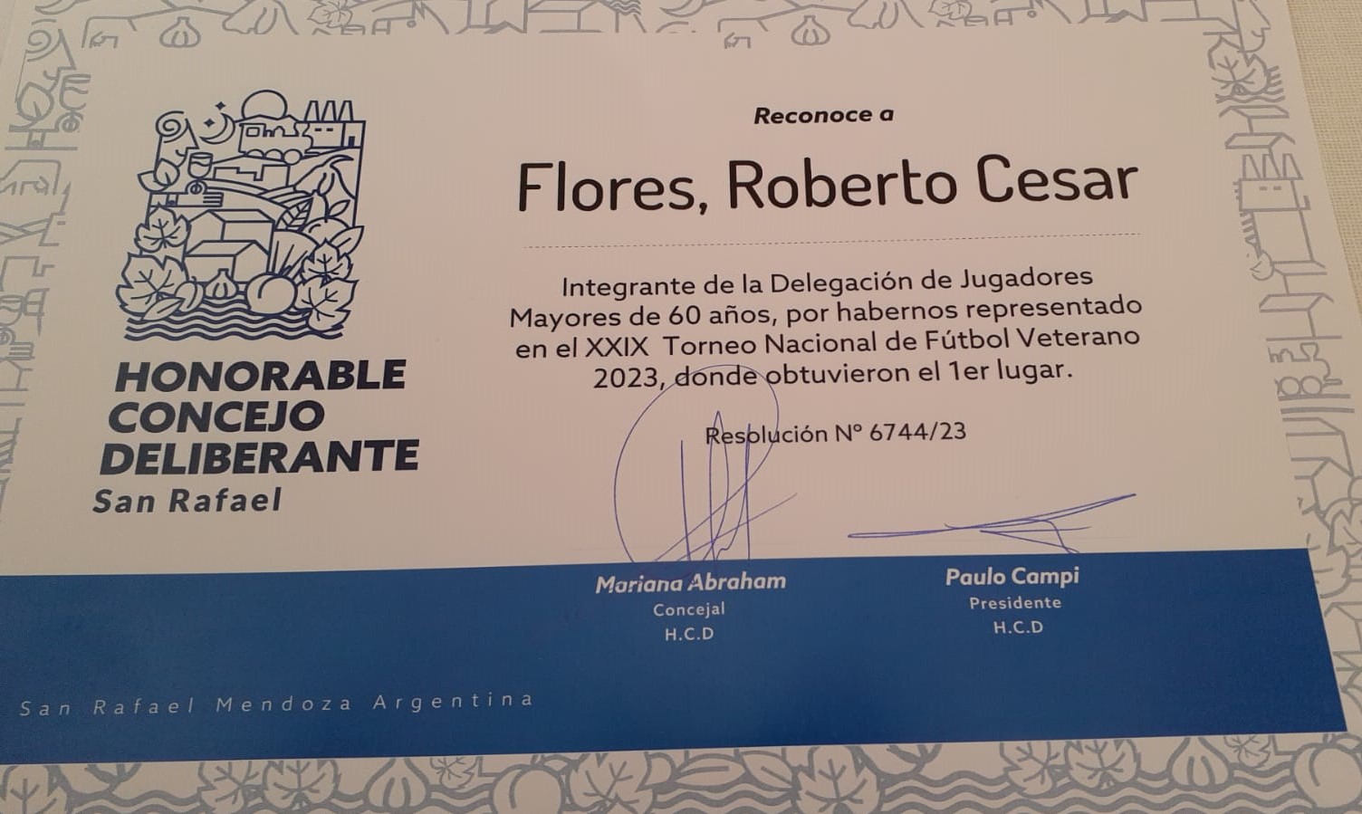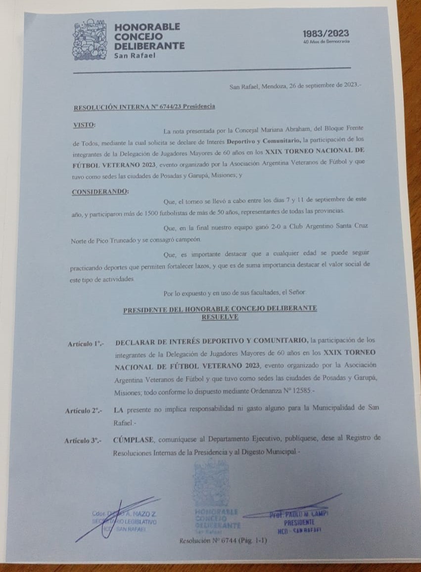 Es que el Honorable Concejo Deliberante de San Rafael Master declaró “De Interés Deportivo y Comunitario la participación de los integrantes de la Delegación de Jugadores Mayores de 60 años en los XXIX Torneo Nacional de Fútbol 2023, evento organizado por la Asociación Argentina Veteranos Fútbol y que tuvo como sede las ciudades de Posadas y Garupá; todo conforme lo dispuesto mediante Ordenanza 12585”.